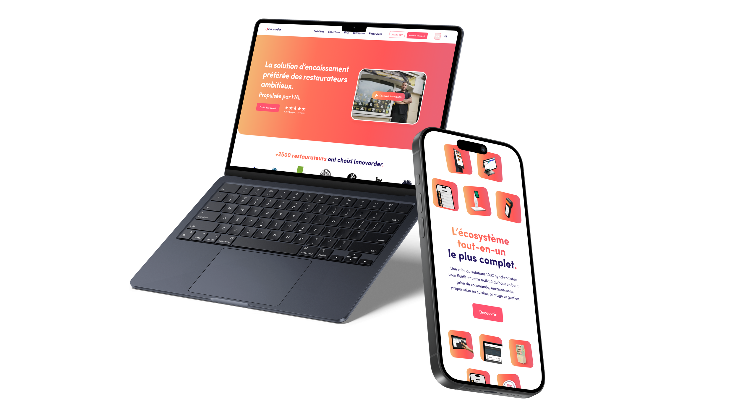 L’objectif de cette refonte était de renforcer la lisibilité de l’offre en mettant en avant l’écosystème global de solutions Innovorder, tout en soulignant sa double expertise : la restauration commerciale et la restauration collective. Mon rôle a été d’optimiser la hiérarchisation des contenus, de travailler sur la cohérence visuelle et d’améliorer l’expérience utilisateur pour offrir une navigation plus claire, moderne et engageante.